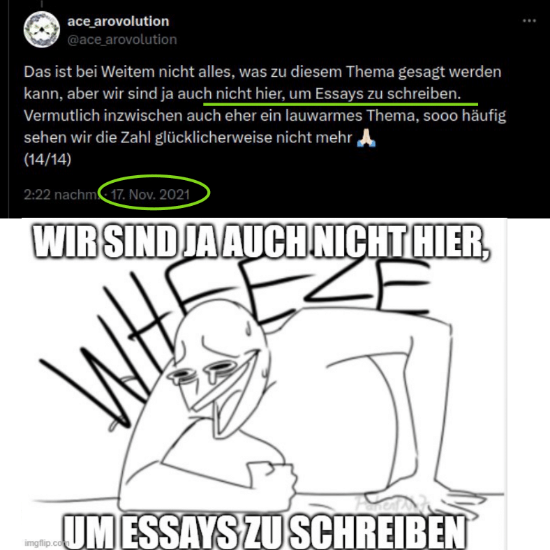 Bildbeschreibung: Screenshot von einem Tweet von ace_arovolution vom 17.11.2021: »Das ist bei Weitem nicht alles, was zu diesem Thema gesagt werden kann, aber wir sind ja auch nicht hier, um Essays zu schreiben. Vermutlich inzwischen auch eher ein lauwarmes Thema, sooo häufig sehen wir die Zahl glücklicherweise nicht mehr (14/14)«. Darunter ein Meme: Eine gezeichnete Figur haut lachend auf einen Tisch, Tränen kommen ihr aus den Augen, dahinter steht »Wheeze«. Drumherum der Text: »Wir sind ja auch nicht hier, um Essays zu schreiben«.